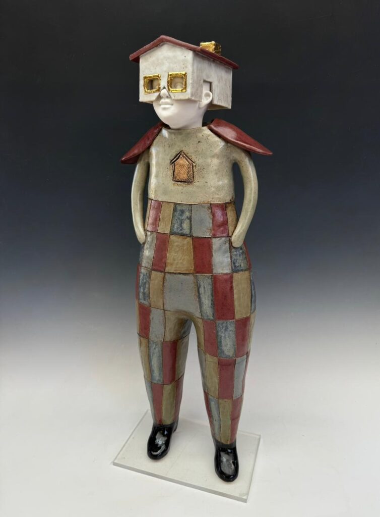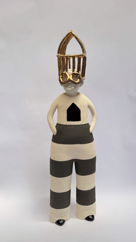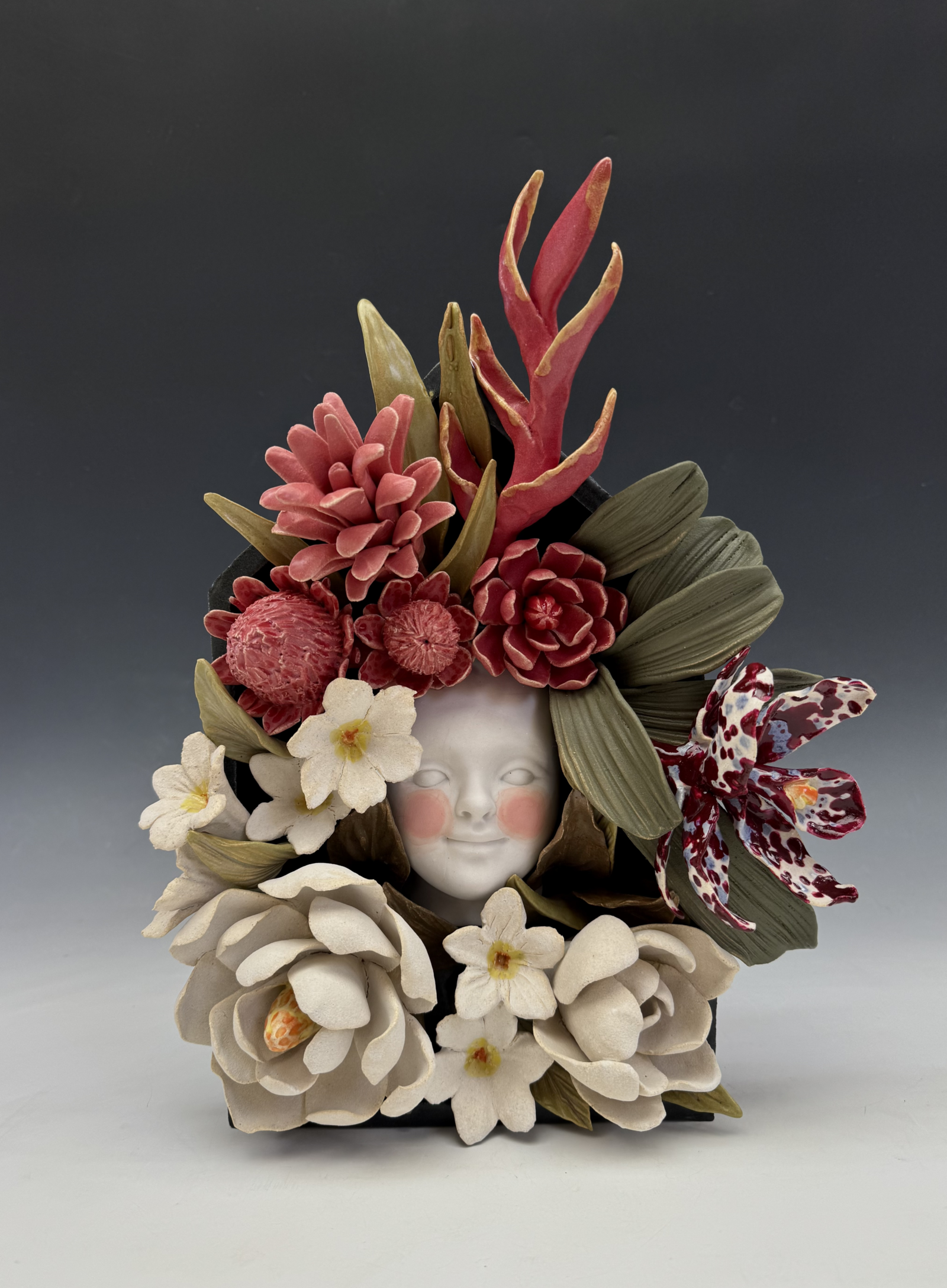 Montoya entiende la cerámica no como un oficio manual, sino como un acto de pensamiento. En sus piezas, el material se vuelve testigo y extensión del cuerpo: templos que resguardan una voz interior, corazones que laten memoria, figuras mitológicas que trasladan la devoción hacia lo cotidiano, rostros que florecen como si llevaran dentro un jardín secreto. Cada escultura es una pequeña arquitectura espiritual, una casa interna que se revela capa por capa.