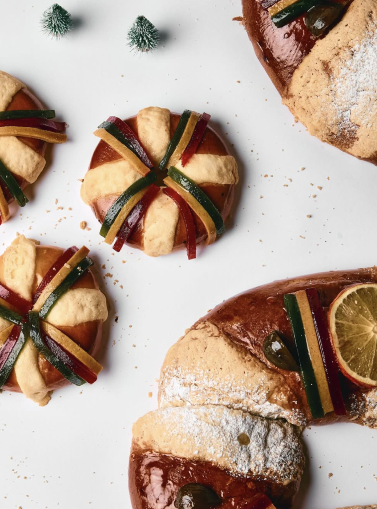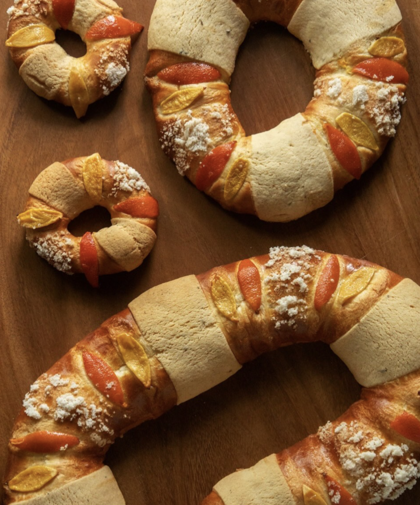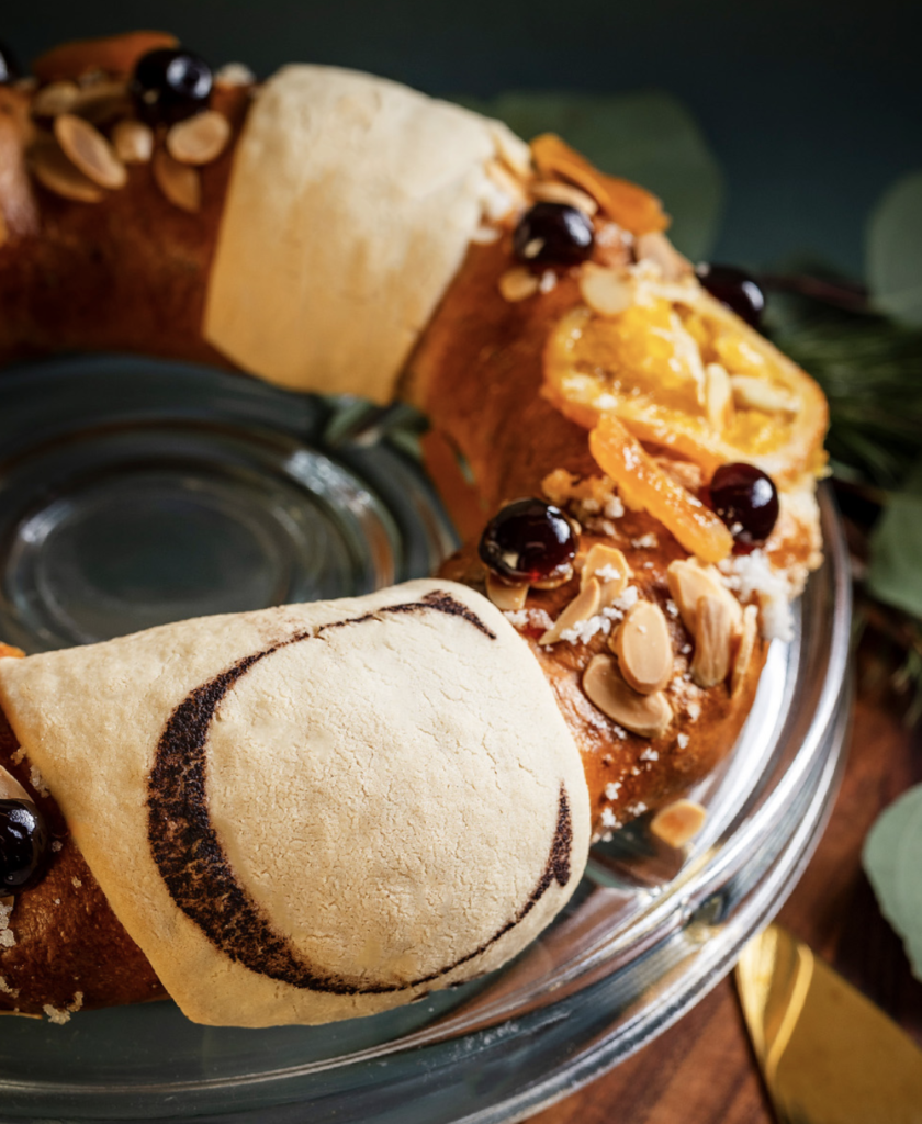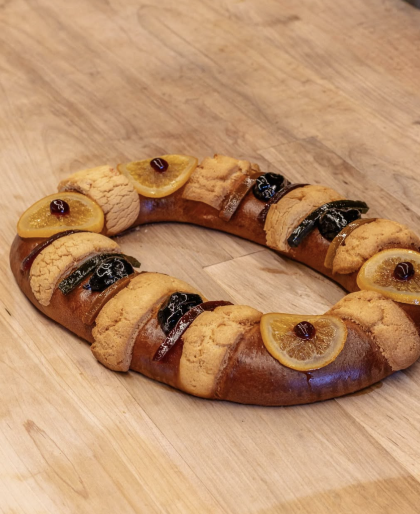 Rosca tradicional con ate típico, higos y naranjas caramelizadas en costra dorada fusionando la receta clásica de Reyes con texturas esponjosas y notas cítricas.