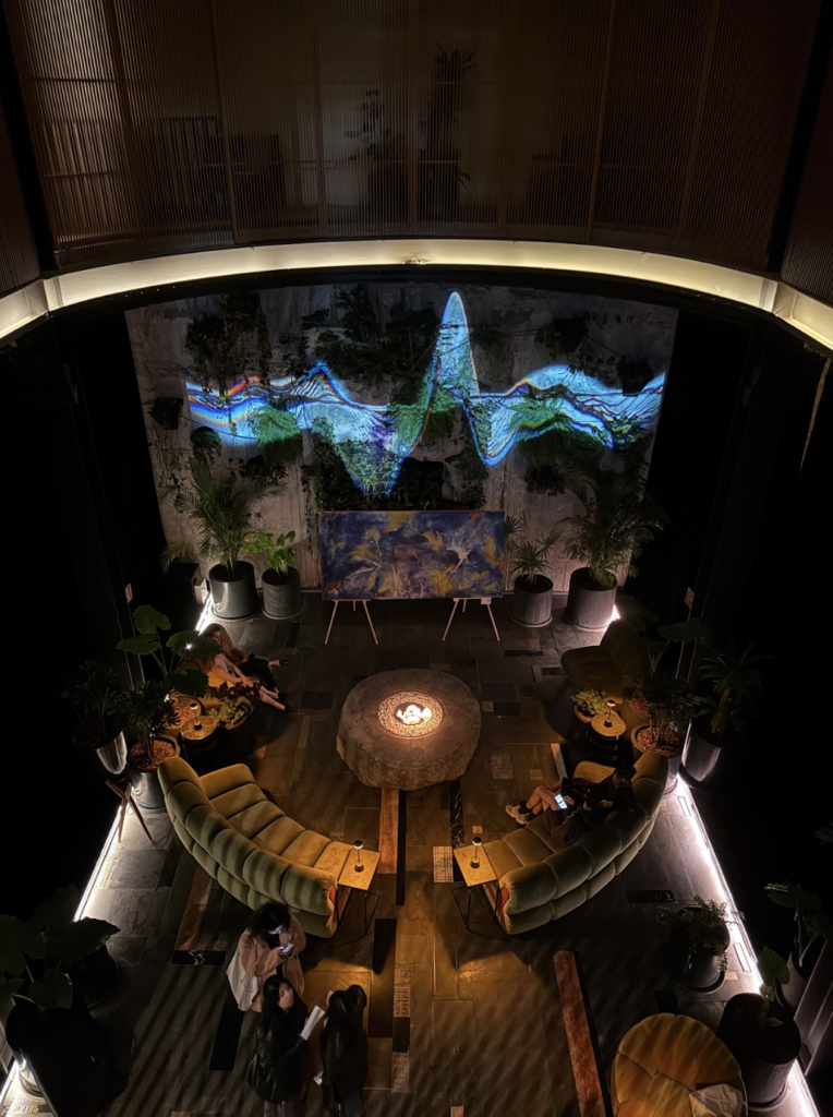 El punto culminante de la noche fue la intervención de mapping digital de la artista, quien logró una atmósfera inmersiva que redefinió los volúmenes del hotel a través de la luz. El ambiente de tal festejo también estuvo a cargo de buena música y Tequila Volcán.