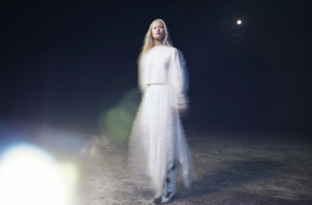 Vista de la colección Analogue Days SS26: vestido floral etéreo con texturas artesanales de AllSaints, paleta sepia y siluetas que fusionan vintage y modernidad para un bienestar sensorial.