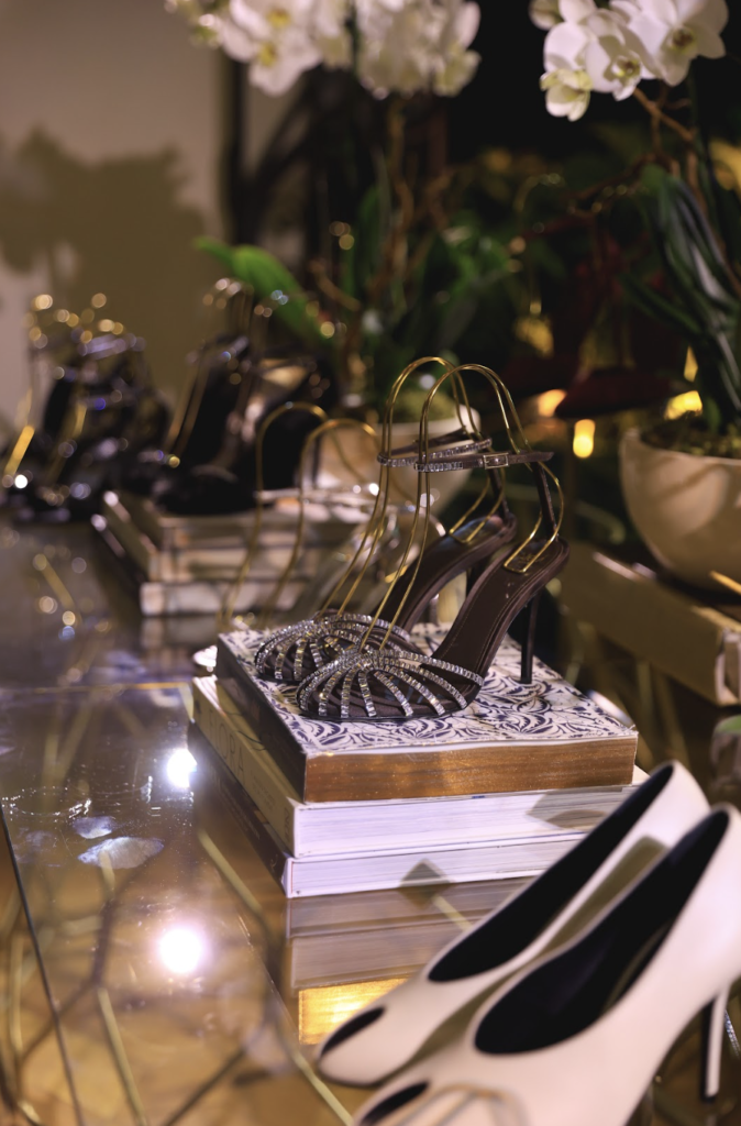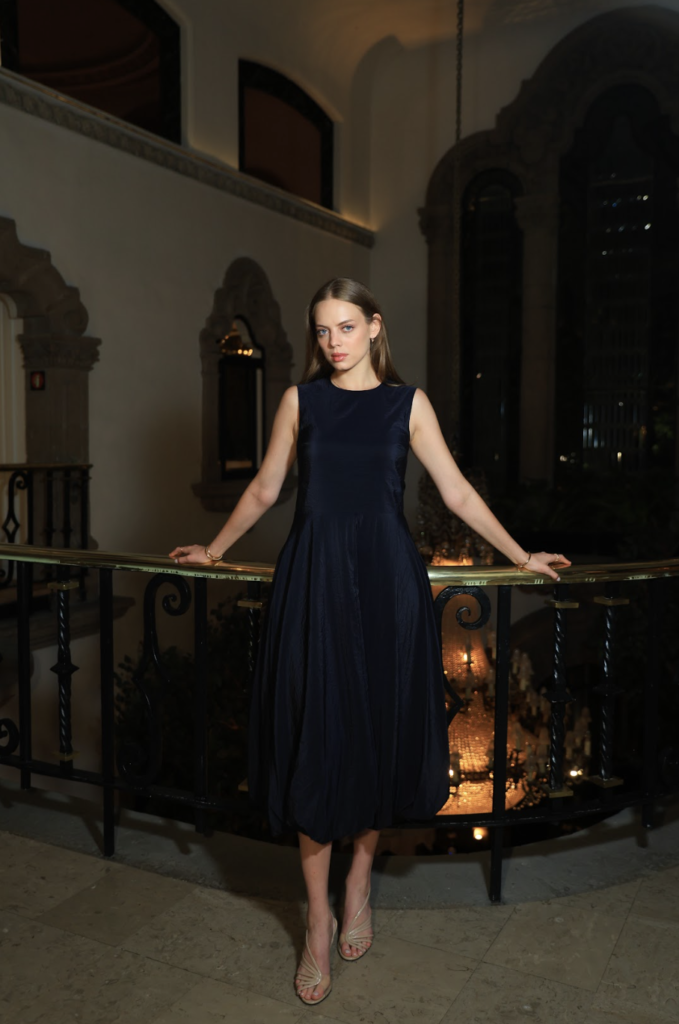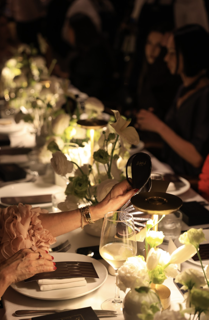 La estética de la velada giró en torno a tonos negros, blancos y nude, un tributo a la feminidad y el lujo discreto que define a Aleví Milano. Texturas sedosas, siluetas precisas y una paleta neutra crearon una sinfonía visual que armonizaba con el espacio, donde la luz suave realzaba cada detalle con maestría.