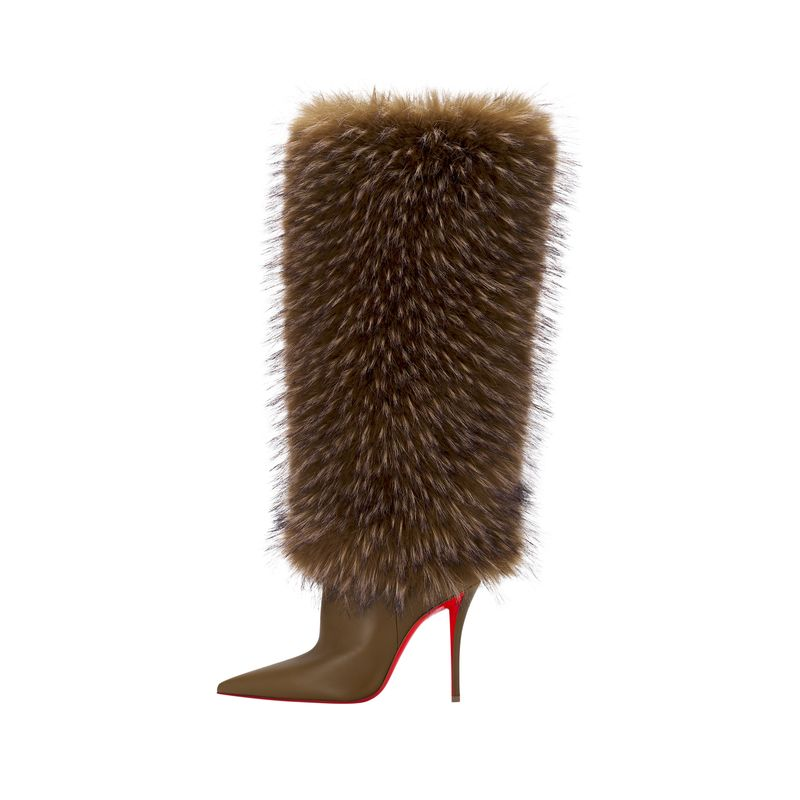 El Yangzee 100 Cordia Fake Fur Bronzo envuelve fake fur bronceado en silueta cordia de 100mm lujosamente texturizada, sellada por suela roja eterna. Este tacón irradia calidez festiva.