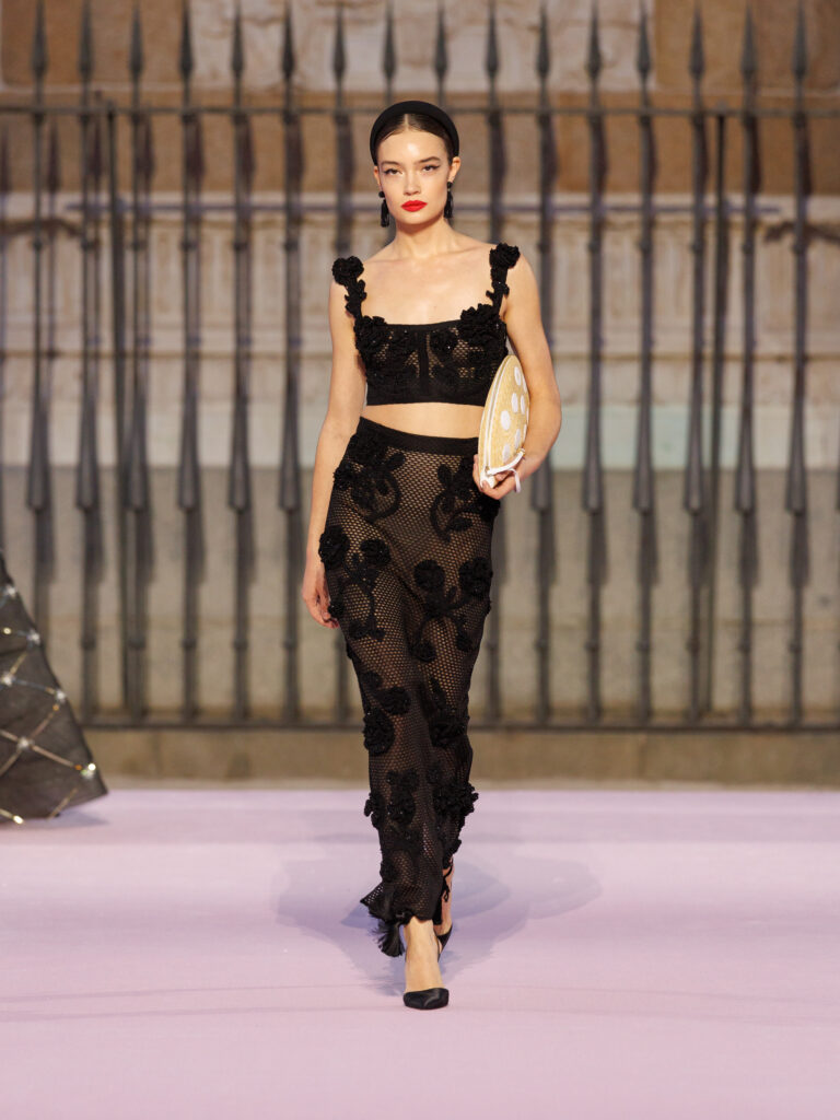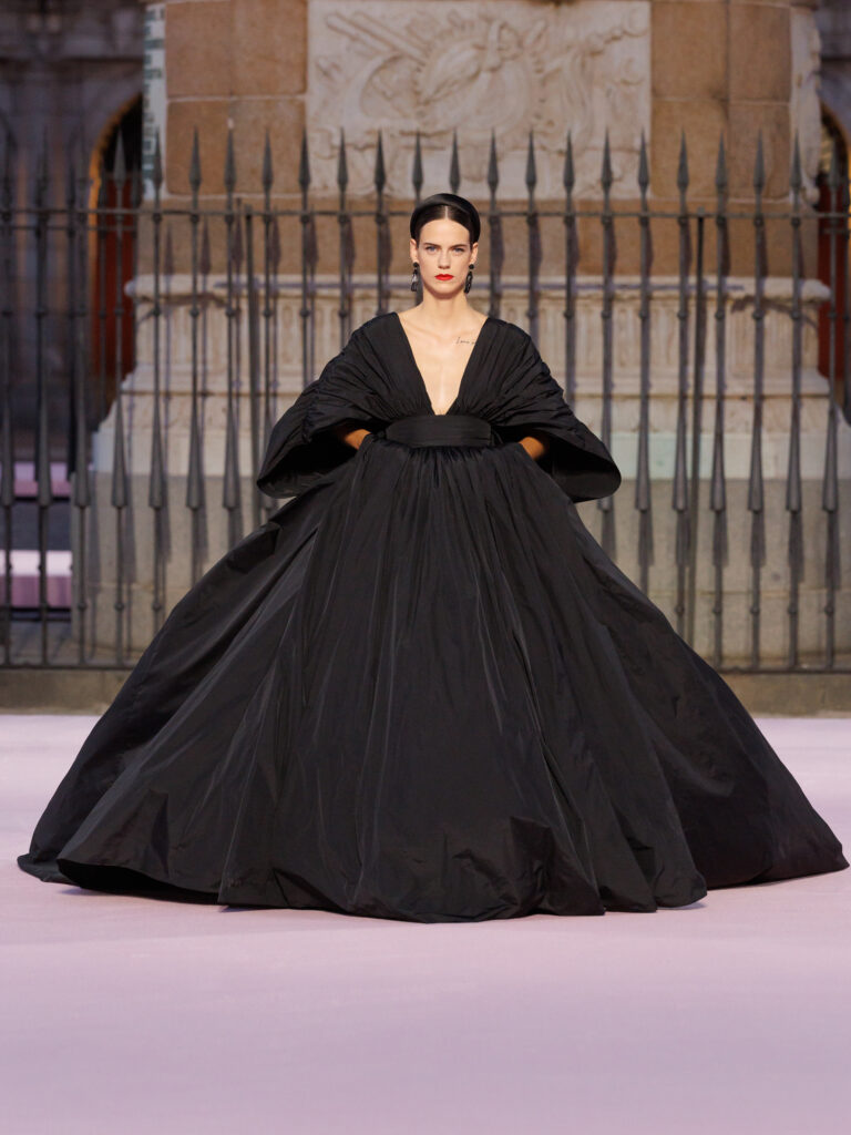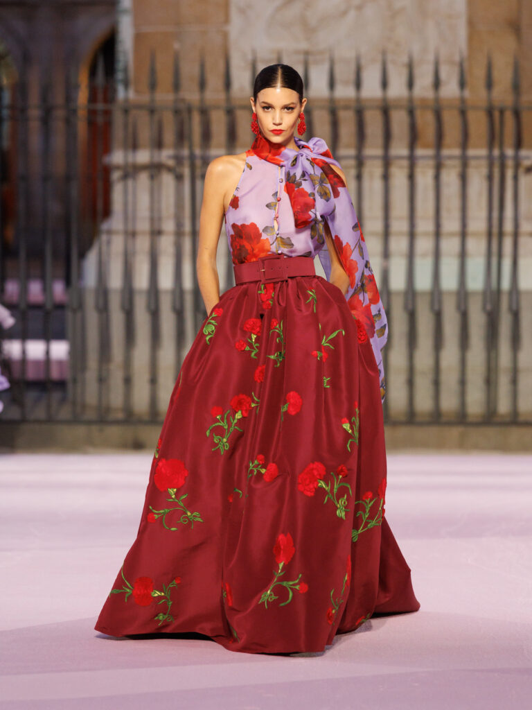 La colección mostró looks que viajaron entre lo monumental y lo que usaríamos frecuentemente. Ball gowns negros con volúmenes tipo Meninas, estampados florales de clavel, rosa y violeta, camisas blancas reinterpretadas y siluetas que jugaron con cortes al tobillo. Los bordados dorados, capas tradicionales, flores de cerámica de Andrés Gallardo y joyería de cristal de Levens terminaron cada look.
