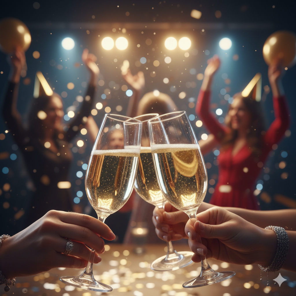 Copas listas para brindis burbujeantes en atmósfera de lujo francés. Lujo navideño que fusiona champagne rojo con celebración íntima.
