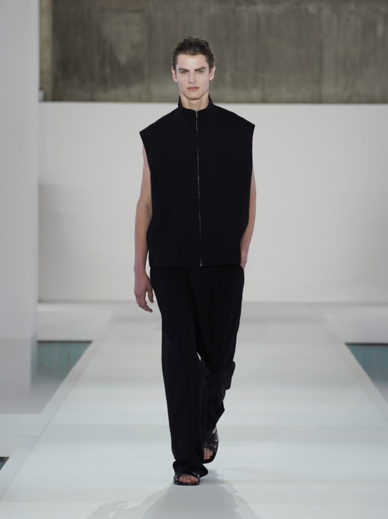 En womenswear, COS explora la belleza cinematográfica de los 90 con siluetas simples y hombros power de los 80. Tejidos de punto translúcidos, sedas plisadas en vestidos off-shoulder y denim en trompe l’oeil definen la propuesta. Prendas exteriores escultóricas contrastan lo clásico y modernidad, completadas por plimsolls, mules arquitectónicos y, por supuesto, el Monument Tote como estrella.