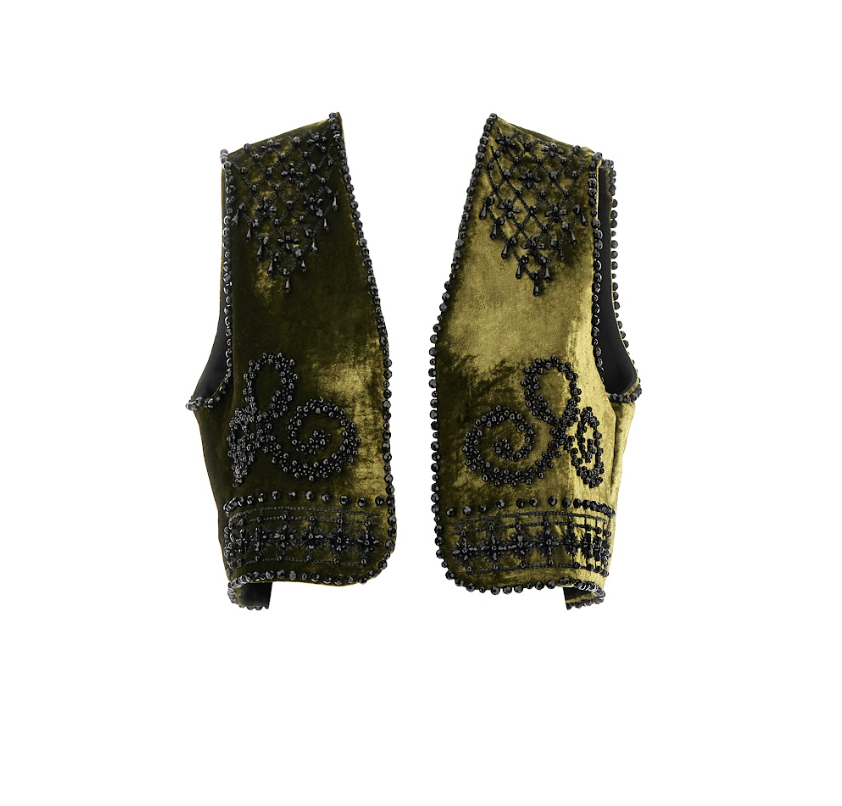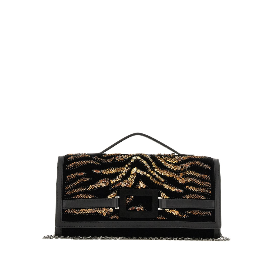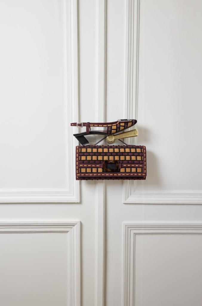 De los archivos de Roger Vivier emerge la línea Rose Vivier con un bolso de pétalos de piel moldeados a mano, transformando artesanía en arquitectura tridimensional. El Belle Vivier, se explora en piel tejida; su clutch resalta hebillas precisas. Destacan los gilets: uno bordado con pasamanería y cristales inspirado en los zapatos de los 50 de la marca, y otro esmoquin con botones de pavé cristalino, fusionando tradición y vanguardia.