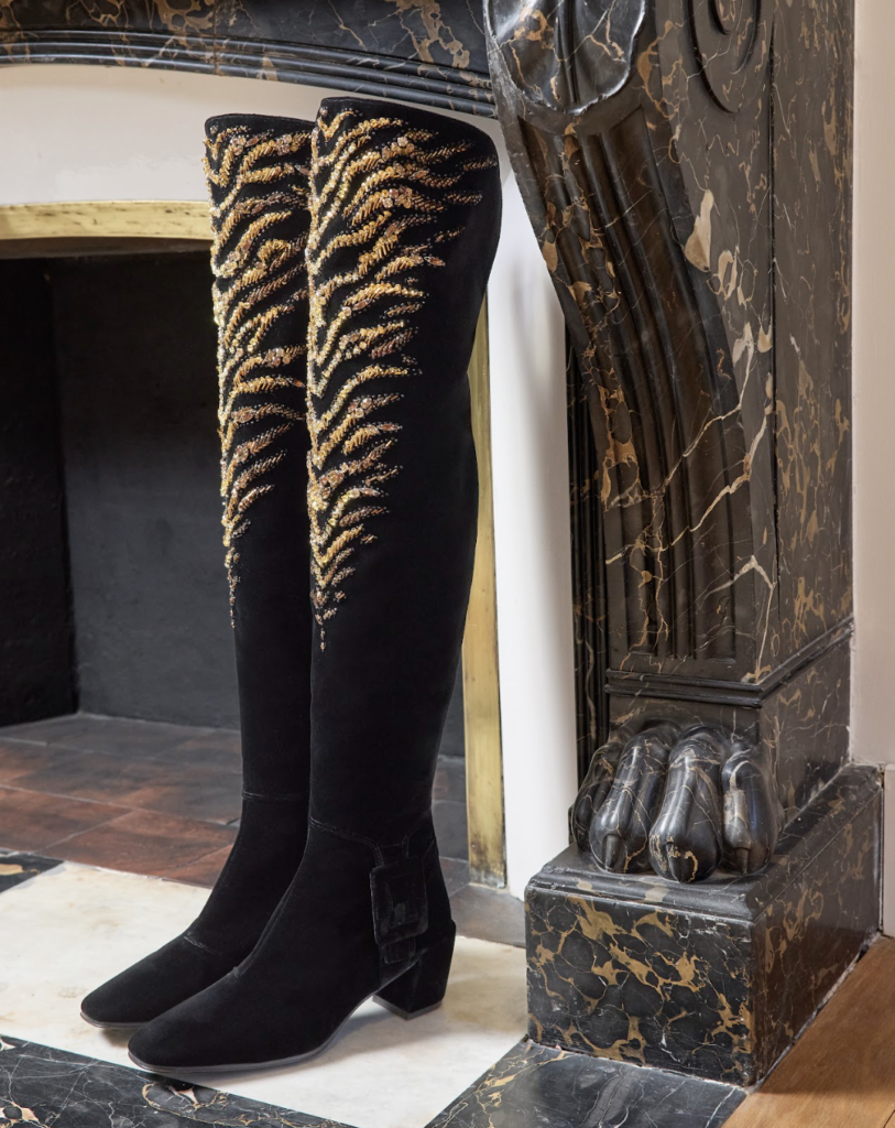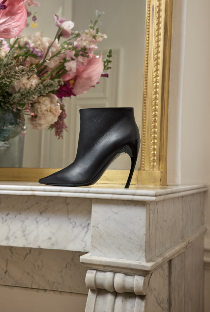 Roger Vivier despliega esta herencia en siluetas rigurosas. Un botín minimalista en napa negra evoca autoridad pura, mientras pumps con lazos metálicos en strass convierten emblemas suaves en escudos arquitectónicos. Versiones bajas del Choc bordado animan cuissardes con hebillas, botas por encima de la rodilla que, como en los 50, simbolizan la amazona moderna: sensuales, envolventes y autónomas.