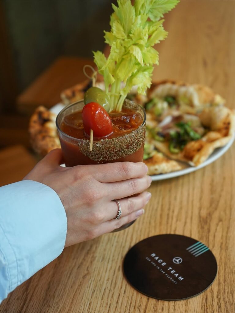Un lugar ideal para disfrutar de las carreras, con pizza en una mano y copa en la otra. Pizza Félix presenta: Pizza Capicola con coppa, coles de Bruselas, vinagreta de merlot, queso provolone y aceite de peperoncino; y, una versión remasterizada de un clásico la XO Bloody Mary.