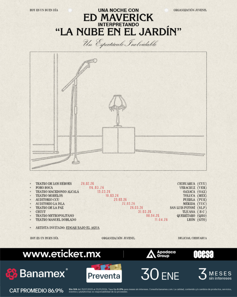 Ed Maverick no para de sorprendernos. Tras conquistar México, Norteamérica, Europa y Sudamérica en 2025 con su álbum La Nube en el Jardín, lanzado en 2024 como un diario abierto del alma, el cantautor anuncia la segunda etapa de su gira. No es solo un tour: es una extensión de su introspección lírica, esa honestidad cruda que ha hecho de sus shows una experiencia compartido. Teatros emblemáticos serán el lienzo perfecto para amplificar esa emoción genuina, donde el público se siente parte de la historia.