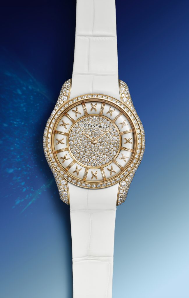 Su carátula engastada con diamantes está enmarcada por un anillo giratorio de esmalte paillonné Tiffany Blue® o esmalte blanco, acompañado del característico motivo de punto cruz en oro amarillo de 18 quilates.