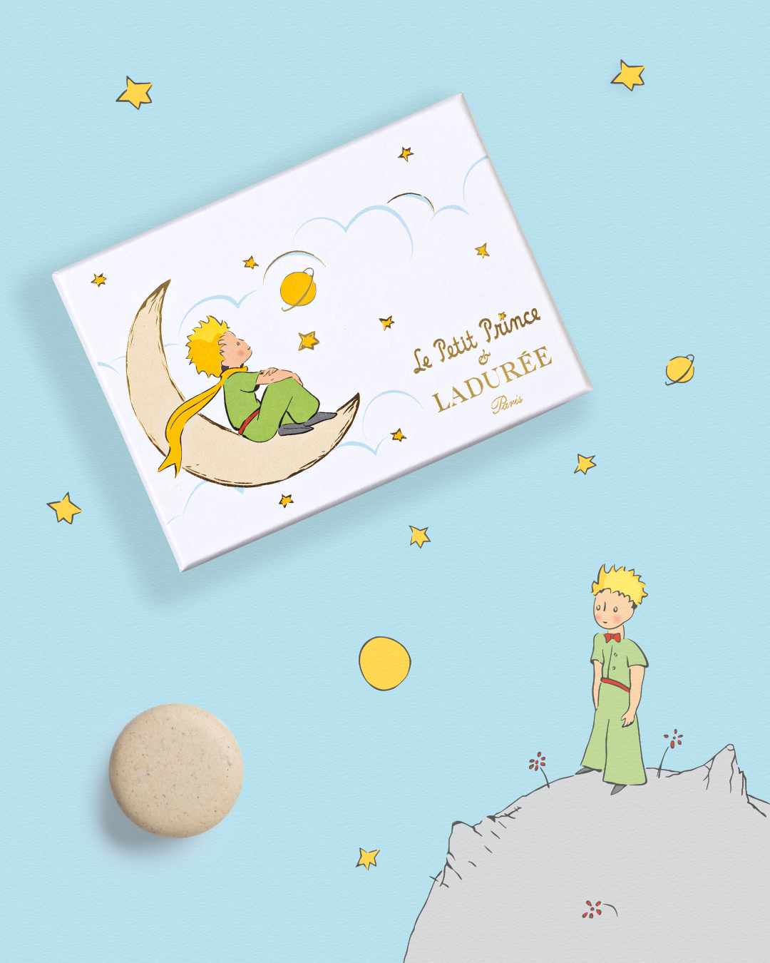 La colección reúne dos piezas: una caja de 12 macarons inspirada en el universo del libro y una edición especial impresa de El Principito.