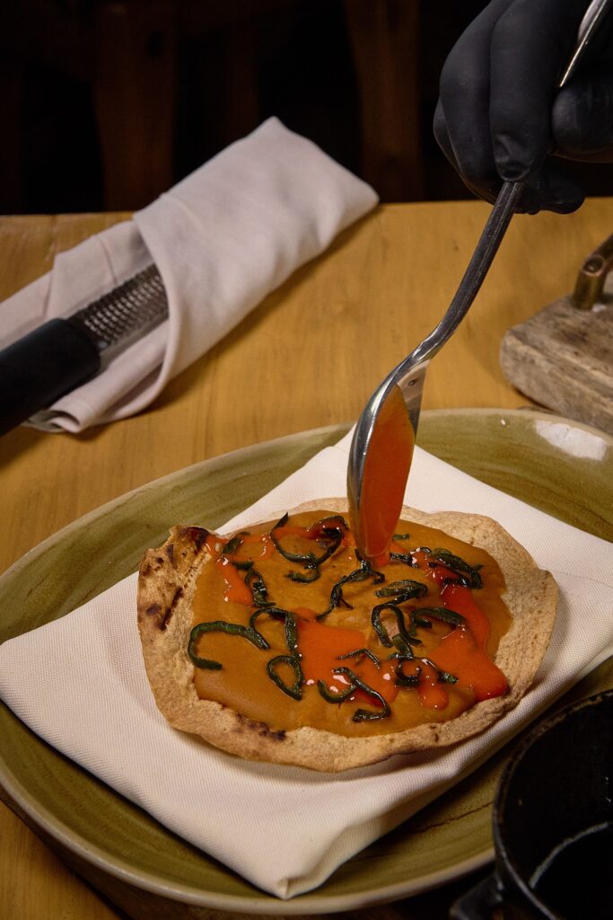 Servida en tortilla de harina, embarrada de frijoles con veneno y trufa negra. Acompañada de chile chilaca, chiles lactofermentados y cebollín.