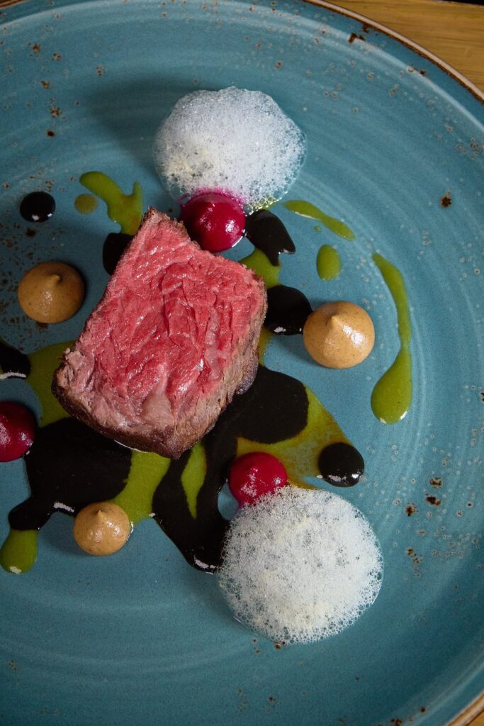 30 días de maduración acompañados de ajo negro, jugo de tomatillo y coliflor, con toques de espuma de sal y betabel con yuzu.