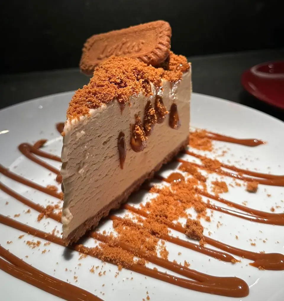 El postre ideal para los amantes del Biscoff: Pastel helado, bañado en dulce de leche y crumble de Lotus.