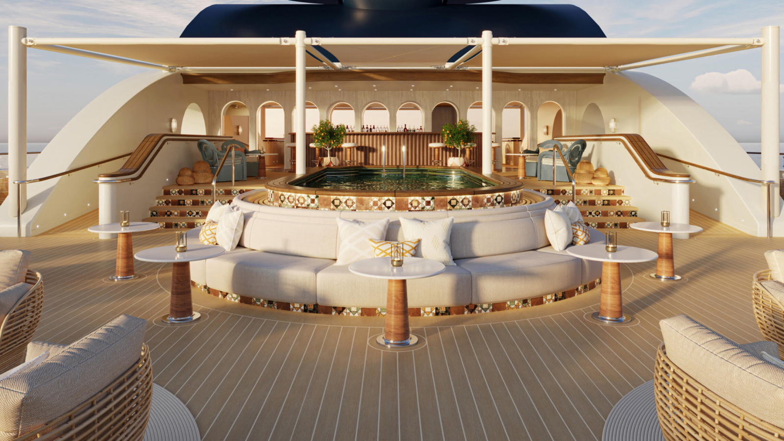 Los bares y lounges también formarán parte de esta experiencia de lujo. Salon funcionará como un espacio social relajado con servicio de alimentos y bebidas durante todo el día. Bar Piscine, junto a la piscina, brindará comida mediterránea y cocteles innovadores. Champagne & Caviar será un espacio exclusivo para adultos, donde los huéspedes podrán disfrutar de caviar, salmón Balik y champagnes premium. Horizon Lounge, inspirado en Marruecos, ofrecerá platillos levantinos y una atmósfera perfecta para contemplar las estrellas. Otros espacios como Marina Bar, Bar O y Cigar Lounge complementarán la oferta con experiencias exclusivas de mixología y maridaje.