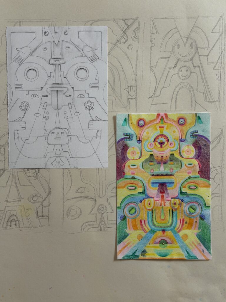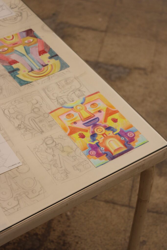 Trabajo todos los días. Boceto, borro, vuelvo a empezar. Primero hago dibujos a lápiz: intuitivos, rápidos, sin pensar demasiado. Si no me convence, no lo corrijo: hago otro. Después los transformo en acuarelas o estudios más complejos para entender la energía del color. Luego vuelvo al lápiz para limpiar la intención. Cada técnica exige cosas distintas: hay piezas más limpias, más estructurales y otras donde me permito libertades formales.