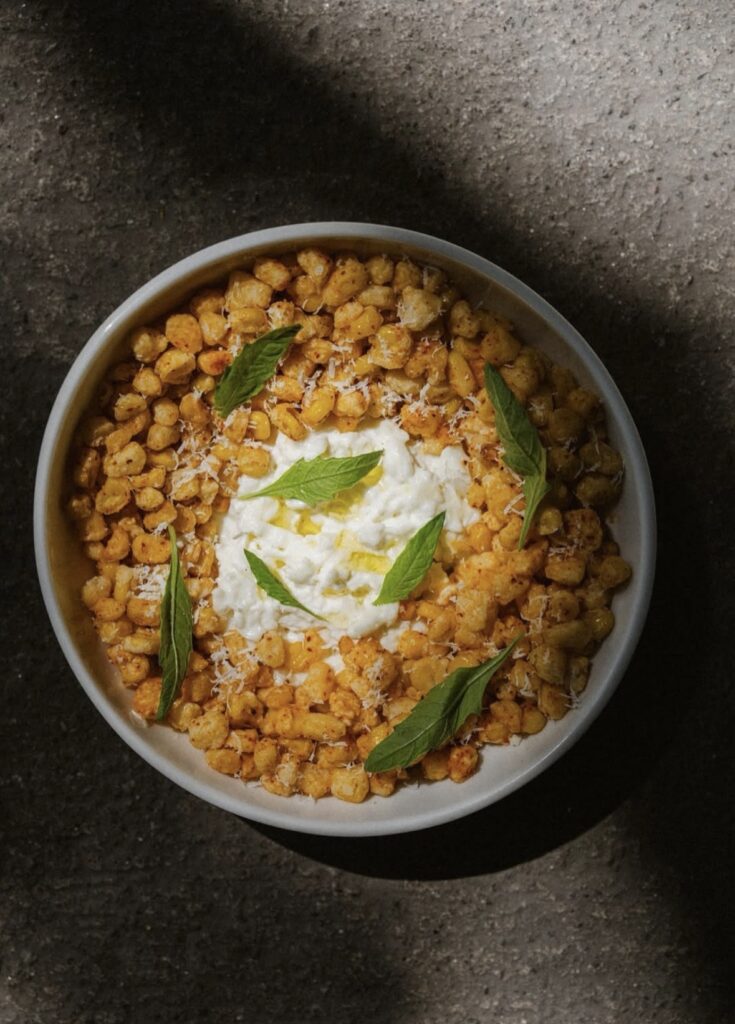 • Los esquites crujientes con stracciatella, cotija, pimienta de sichuan.