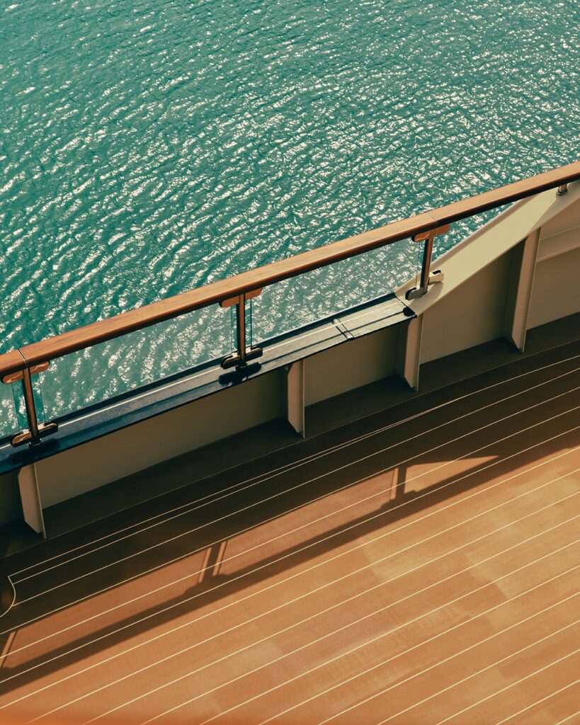 Uno de los espacios más emblemáticos de la embarcación es la Funnel Suite, ubicada en la proa, con vistas panorámicas ininterrumpidas. Al otro extremo se encuentra la Loft Suite, con vista hacia la popa, ofreciendo otra perspectiva para disfrutar del mar.