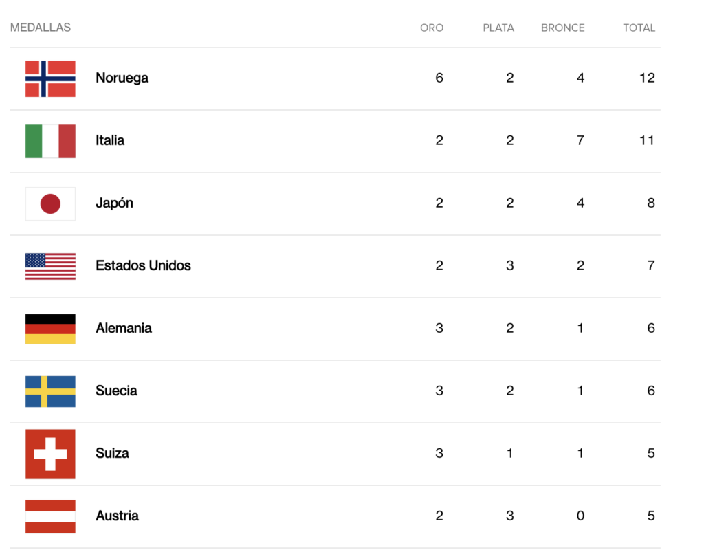 Tabla del medallero Juegos Olímpicos Invierno 2026 Milán-Cortina al 10 de febrero
