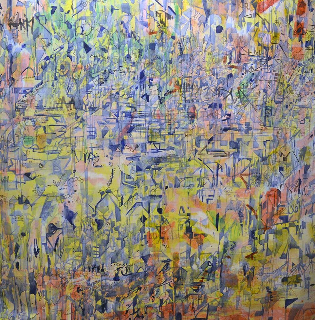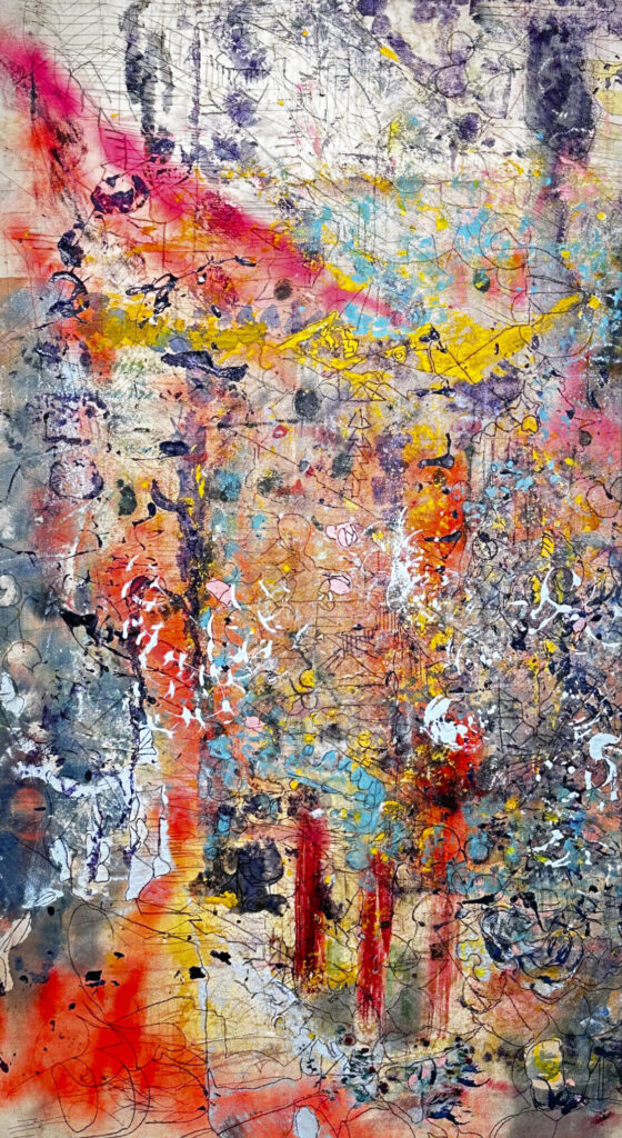 Las piezas juegan con la tensión entre lo orgánico y lo geométrico. Por un lado, los chorreados, las texturas y las manchas remiten a lo natural y a lo impredecible. Y, por otro, los trazos rectos se pueden entender como arquitectura o lo artificial. Esa dualidad refuerza una lectura donde la naturaleza y lo humano no se oponen, sino que dialogan entre ellos.