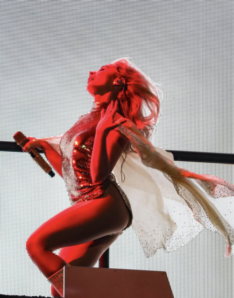 Sabrina Carpenter elevó su presentación con un estilo impecable curado por su estilista Jared Ellner y el director creativo Brett Alan Nelson, quienes optaron por atuendos a medida de Christian Dior diseñados por Jonathan Anderson, complementados con un suéter azul cobalto de cuello alto sacado de su propio armario; entre mini vestidos, lencería, capas, flecos y brillo, Sabrina llevó el estilo retro americano a otro nivel mientras deslumbraba en el escenario.