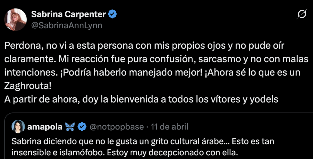 Sabrina Carpenter se disculpó pronto en redes, reconociendo el error y enfatizando respeto por las culturas que inspiran su arte, lo que mitigó el backlash . Esta respuesta sincera transformó la controversia en una muestra de crecimiento, alineada con su evolución como artista madura.