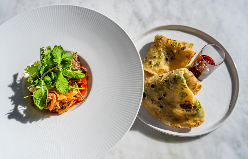 En un mismo platillo conviven técnicas, ingredientes y referencias de distintos lugares del mundo. El mejor ejemplo es la terrina de cordero servida con una mezcla de hojas y hierbas frescas, acompañada de un demi-glace de cordero y manzanilla, que es posible encontrar en el Kimpton KAFD Riyadh.