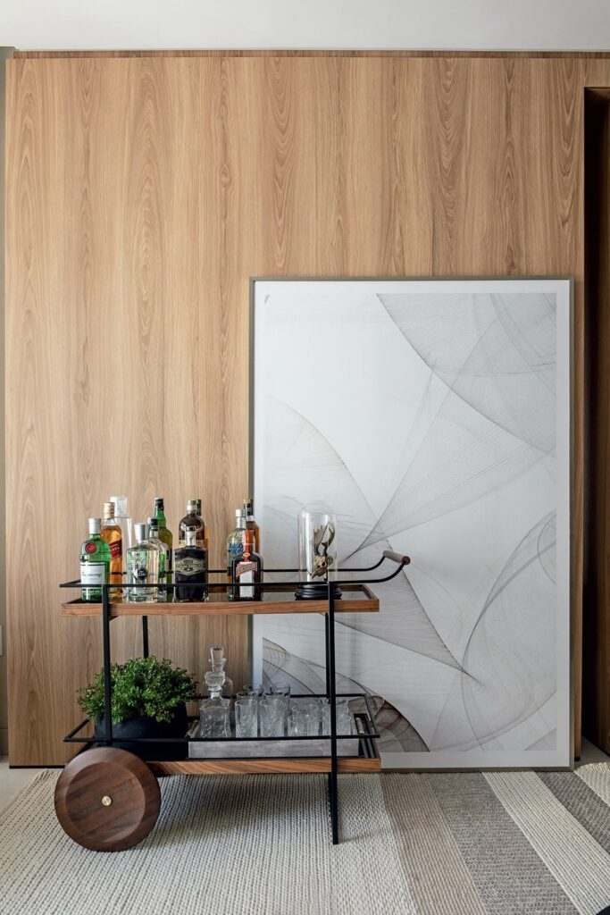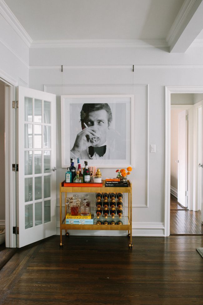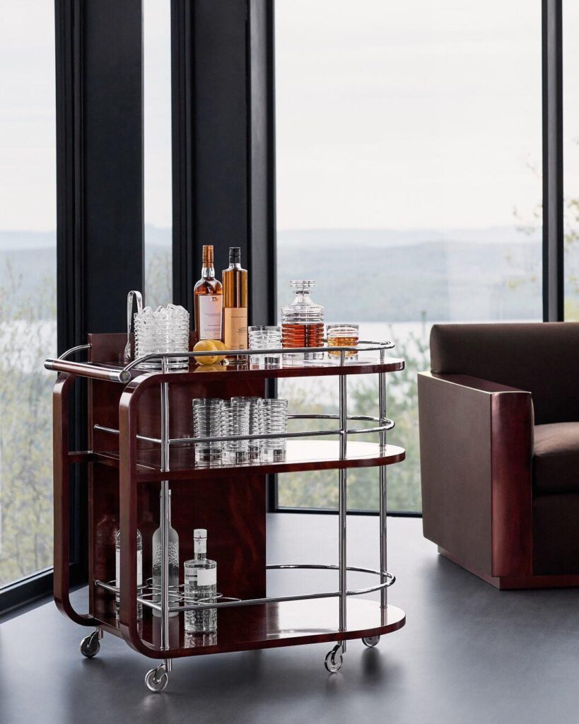 Los bar carts han ganado popularidad porque son la forma más fácil y móvil de integrar un punto social en casa sin ocupar demasiado espacio. Funcionan bien porque no exigen una zona dedicada y se pueden adaptar a cómo usas el espacio en el día a día. También tienen algo más interesante: pueden convertirse en ese rincón un poco más libre dentro de la casa. Puedes cambiarlo, moverlo, decorarlo distinto según el mood siendo tan divertidos o classy como los quieras. Incluso funciona perfecto como ese acento maximalista del que hablábamos antes, un lugar donde sí vale meter color, botellas, libros o piezas más llamativas