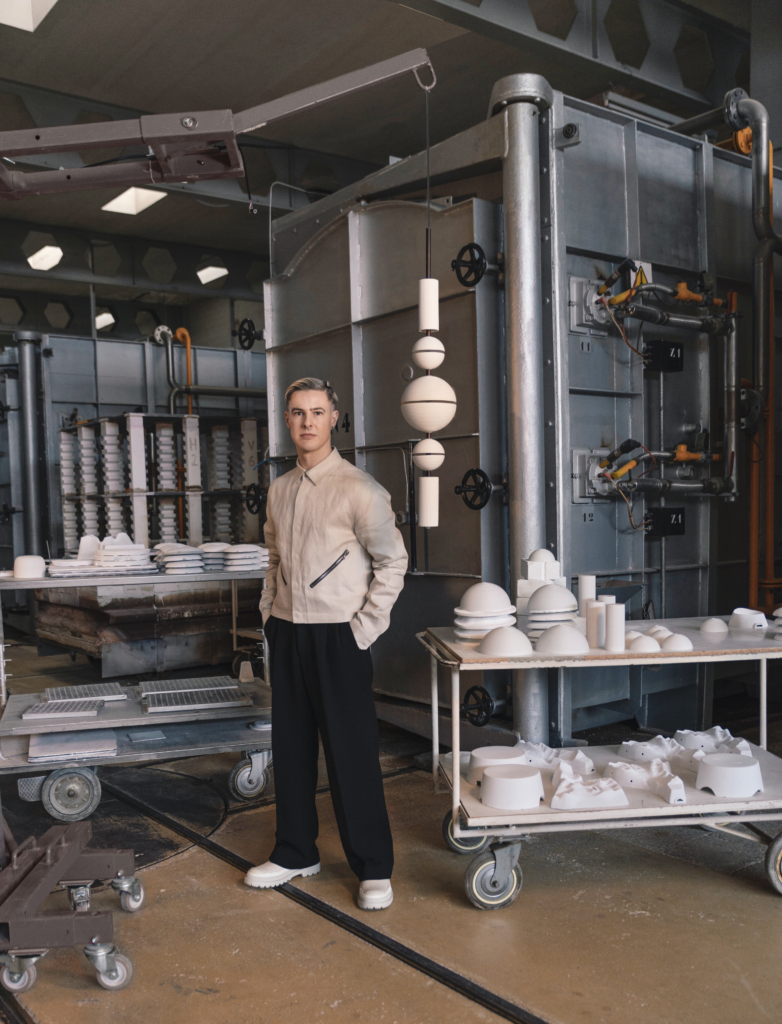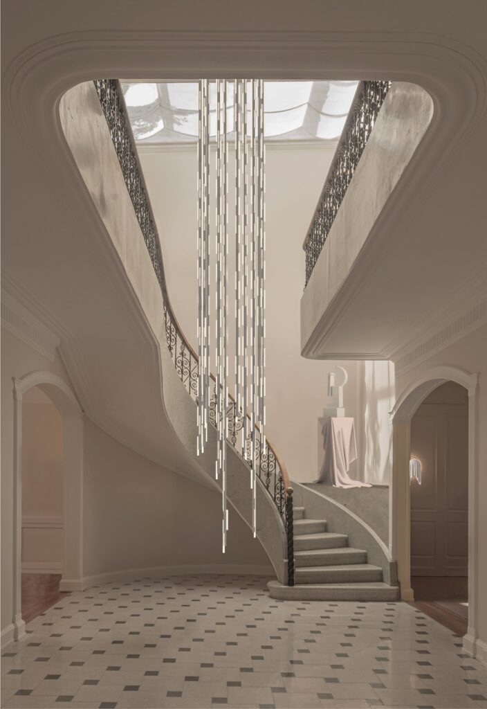 Las Requiem, talladas en yeso por el propio Broom incluyendo la nueva para pared, crean calma en pasillos y entradas, mientras que la premiada Chant Portable Lamp de vidrio soplado se funde con la arquitectura como esculturas que iluminan con sutileza.