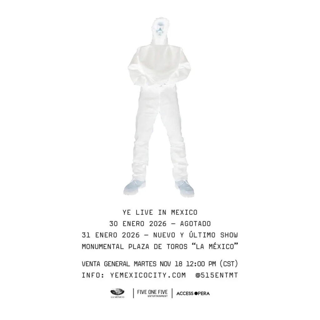 Ese carácter visionario es el que hoy vuelve a colocar a la CDMX en el centro de la escena musical global. Ye regresará al país por primera vez en 17 años con dos presentaciones únicas en la Monumental Plaza de Toros “La México”, el 30 y 31 de enero de 2026. El anuncio provocó una respuesta inmediata: la primera fecha se agotó en apenas 12 horas, rompiendo el récord histórico de ventas del recinto, una marca que hasta ahora pertenecía al partido de exhibición entre Roger Federer y Rafa Nadal. Ante la demanda extraordinaria, se abrió una segunda fecha.