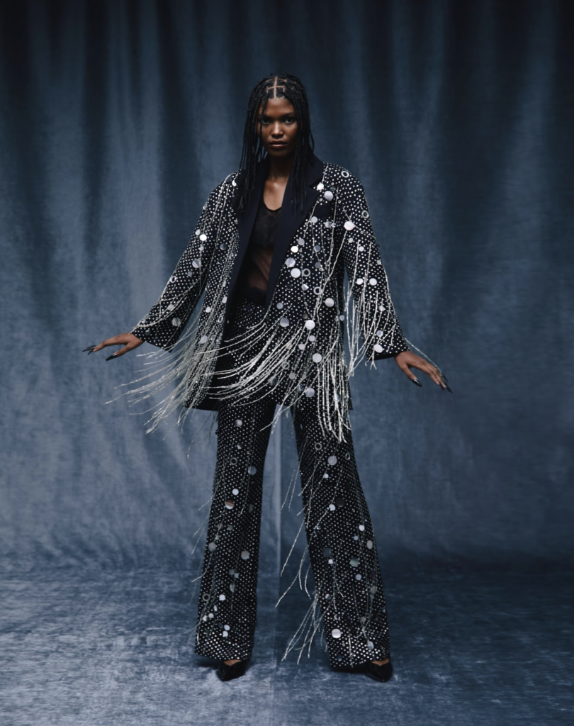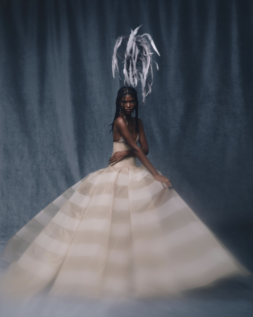 El master look encapsula esto con una falda arquitectónica de franjas en crin y organza rígida que imita el movimiento expansivo de las corrientes marinas. Cristales, lentejuelas y transparencias recrean el sol filtrado por el agua y la luz de especies abisales, fusionando lujo teatral con cotidianidad.