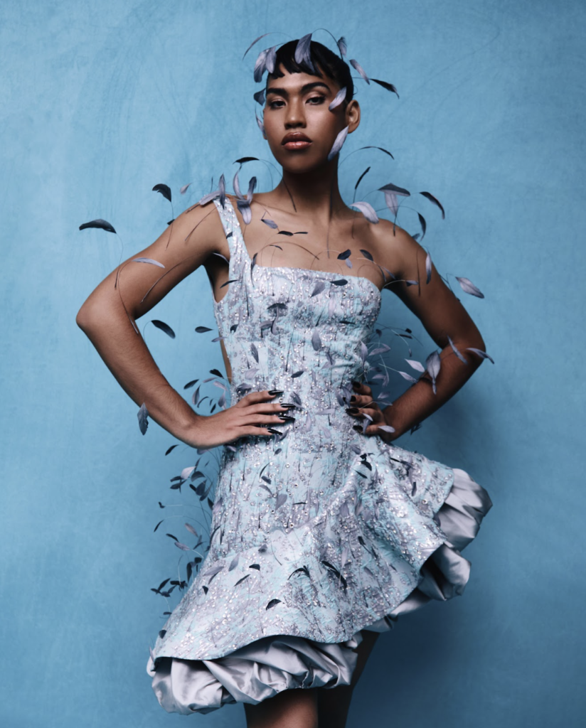Inspirada en el encuentro entre una sirena y un buzo, ULTRA VOYAGE explora un universo “ultra marino” con técnicas depuradas que simulan corrientes oceánicas y brillos abisales. La colección equilibra textiles de lujo como terciopelo y plumas con denim urbano, todo en una paleta que evoca el mar desde arenas blancas hasta negros profundos.